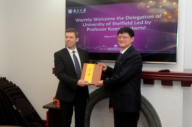 Nanjing University and the University of Sheffield will strengthen their ties and explore new models of cooperation in new areas, agreed Hu Jinbo, secretary of CPC’s Nanjing University committee, and Koen Lamberts, president & vice-chancellor of Sheffield, and his delegations, when Hu received the British visitors on Gulou Campus on March 4.
