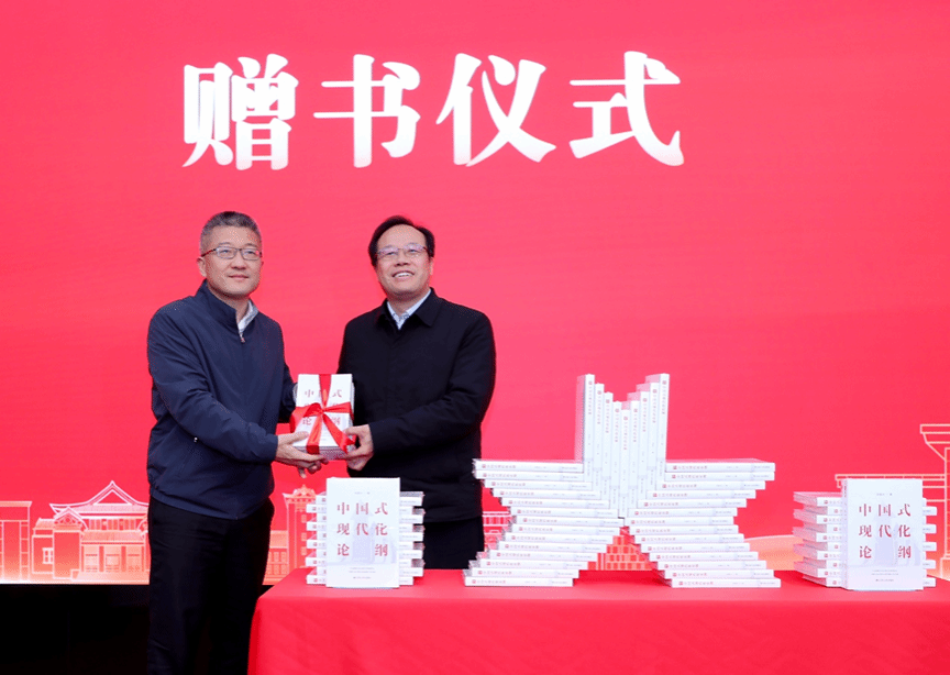 Zhang Aijun, Tan Tieniu, Hong Yinxing, and Sun Zhenfu, Secretary of the CPC Jiangsu Phoenix Publishing & Media Group Committee jointly launched The Chinese Path to Modernization. Xu Hai, Deputy General Manager and Editor-in-Chief of Jiangsu Phoenix Publishing & Media Group, introduced the planning and publishing process of this book. Lin Haitao, Deputy General Manager of Phoenix, presented a copy of the book to Huang Xianjin, Director of Nanjing University Library, as a gift. The ceremony was hosted by Wang Baoding, President of Jiangsu People's Publishing House.