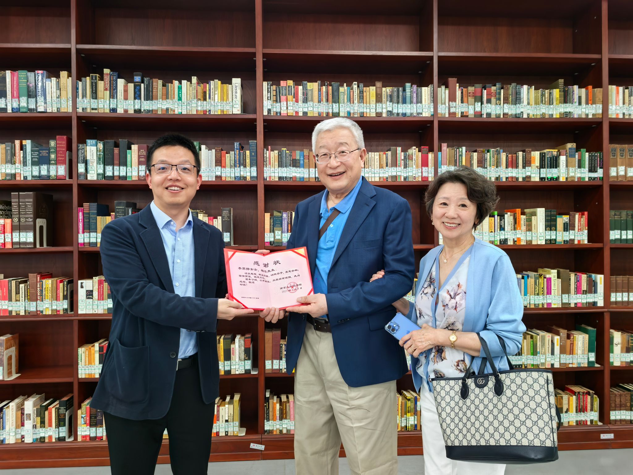 On behalf of NJU Library, Xie extended a warm welcome to the couple, and presented them with a certificate of donation in recognition of their generous contribution. The literature donated by Mei and Li encompasses multiple schools of Western-language literature and works of significant authors, representing creative achievements from various countries, ethnic groups, and historical periods. Mei expressed his hope that this collection of books would "come to life" through NJU Library, helping students broaden their academic horizons.