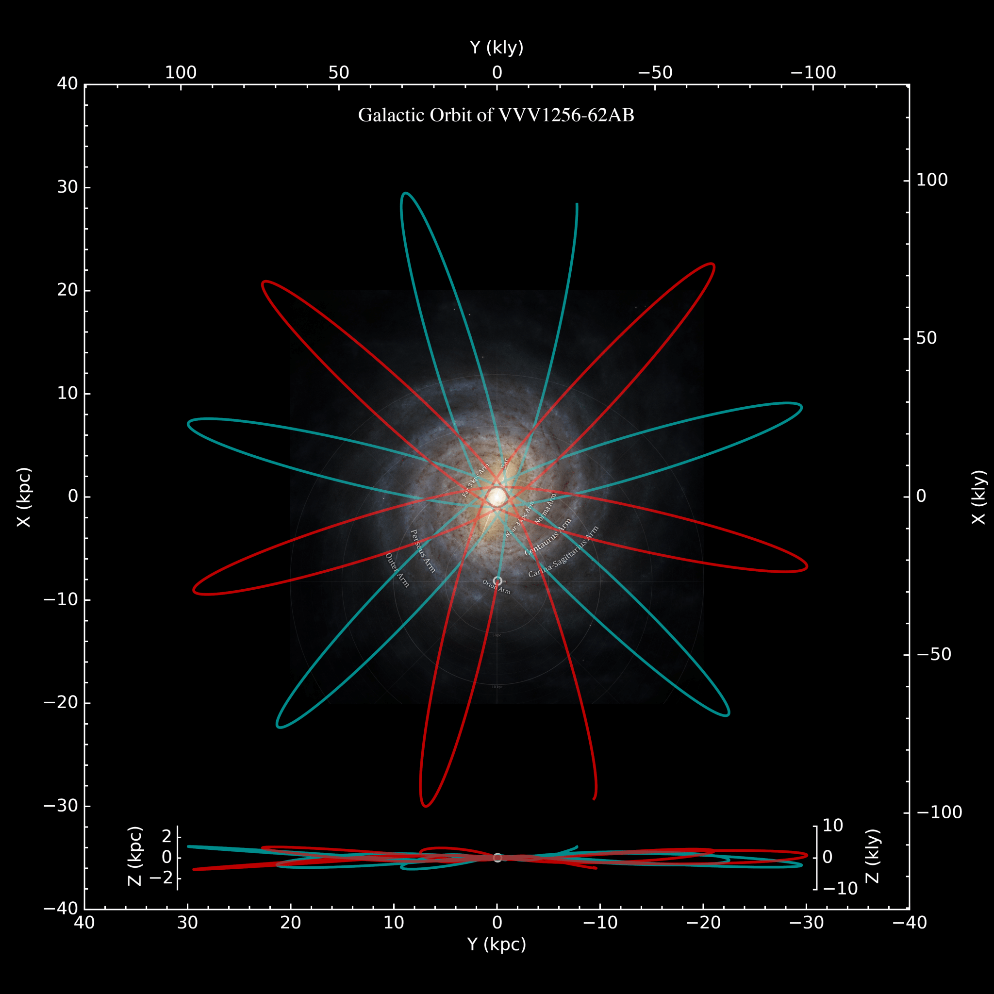 Figure 4. VVV 1256?62AB’s average orbit from the past 2 Gyr (cyan curves) to the future 2 Gyr (red curves). The background image is the spiral structure of the Milky Way based on Gaia DR3 (Credits: ESA/Gaia/DPAC, Stefan Payne-Wardenaar, CC BY-SA 4.0 IGO). Its current location near the Sun is indicated by a white circle. The edge-on orbit view in [Y, Z] space is plotted on the same scale and shown at the bottom. Credits: Roberto Raddi, Zenghua Zhang, MNRAS. Also see orbital motion on bilibili.