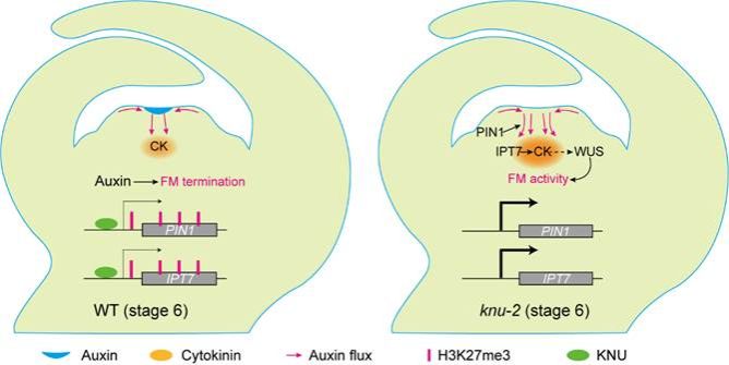 In summary, this study reveals a novel mechanism by which KNU mediates the regulation of auxin and cytokinin activity to terminate the FM, further advancing the understanding of how KNU ensures the timed termination of FM activity. This work provides new insights and directions for future research on the regulatory mechanisms of flower development.