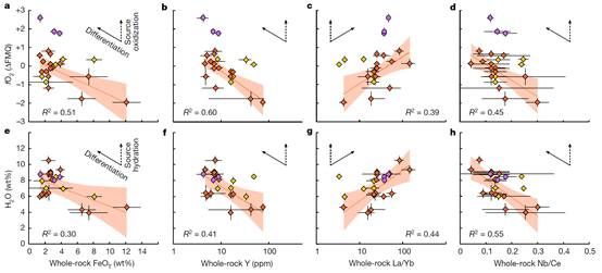 图3 始太古代(40 – 36亿年)花岗质岩浆氧逸度和水含量的升高指示俯冲启动,红色为太古宙花岗质岩石数据,白色方框为澳大利亚Jack Hills碎屑锆石数据