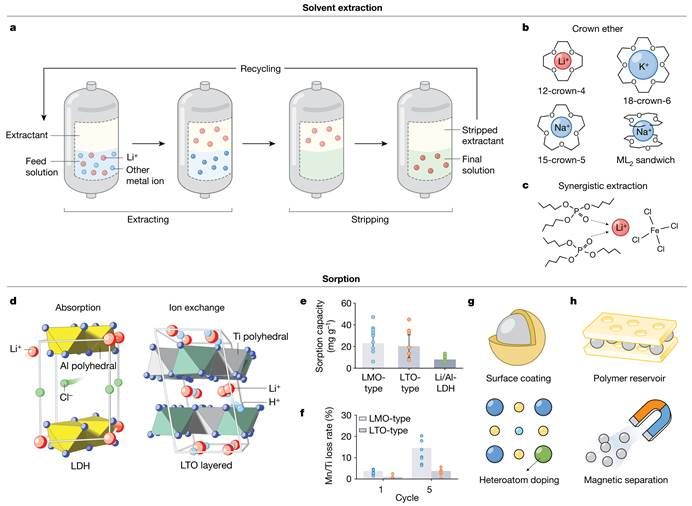 萃取法被广泛应用于从卤水中提取金属离子。文章中指出,近年来,研究人员通过设计新型溶剂,特别是以TBP-FeCl3(磷酸三丁酯-氯化铁)组合为代表的协同萃取剂体系,显著提高了从低品质卤水中提取锂的效率。文章详细分析了几种常用的溶剂体系及其在不同条件下的表现,指出尽管溶剂提取法能够提高锂回收率,但所使用的有机萃取剂和酸液洗脱剂的经济、环境成本较高,其未来发展中一方面应当关注于降低上述成本,此外还应注重萃取剂的分子结构设计,优化其选择性和萃取效率。