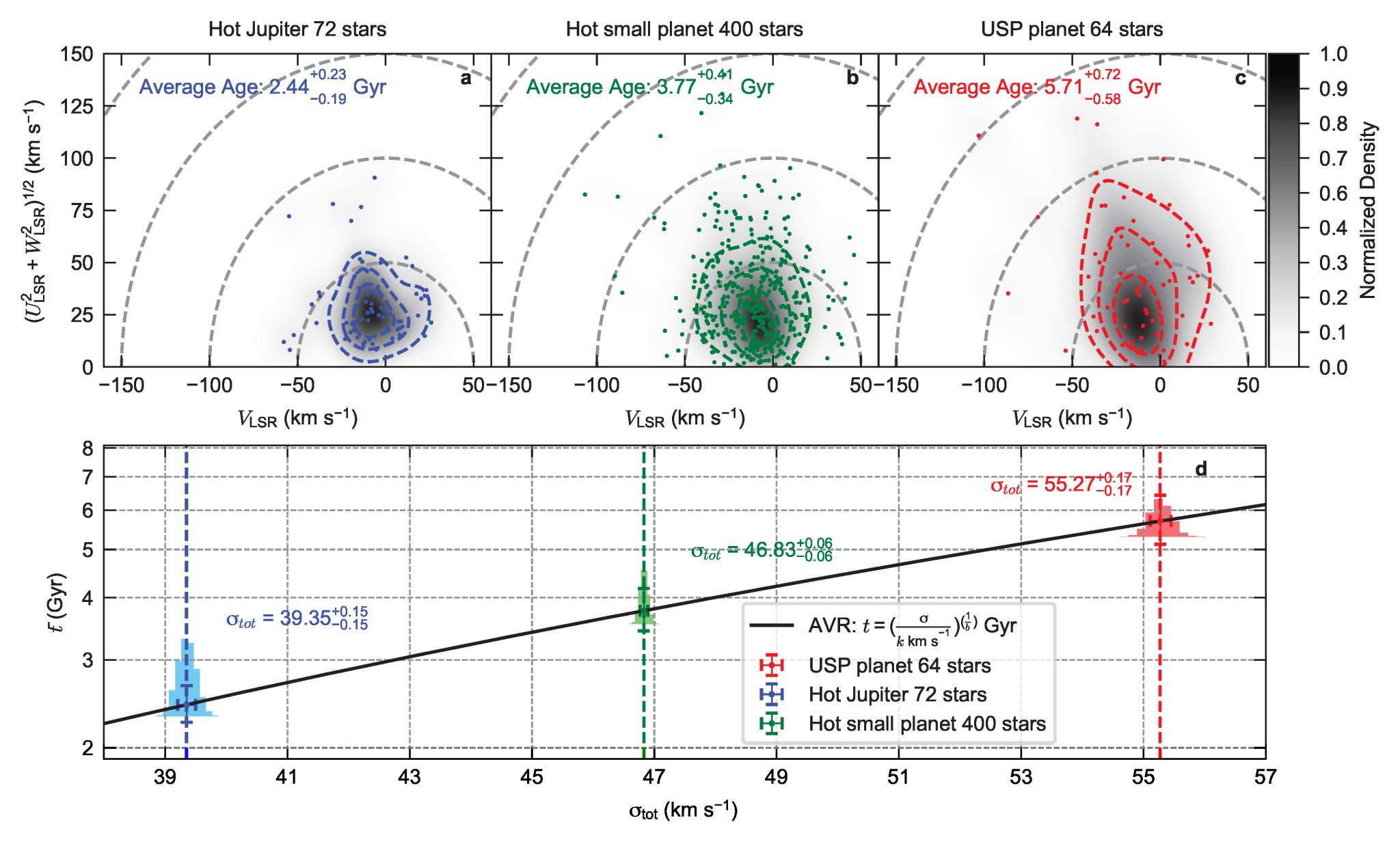 利用估计年龄的运动学方法,研究团队首先借助LAMOST和Gaia观测数据,计算出行星系统宿主恒星的运动学参数和运动学年龄。研究发现,相较于热木星和其他短周期小质量行星,超短周期行星的宿主恒星运动速度更大,位于银河系厚盘中的比例更高,且年龄更老(图1)。也就是说,与其他短周期行星相比,超短周期行星的宿主恒星更加年老、运动学上更“热”。