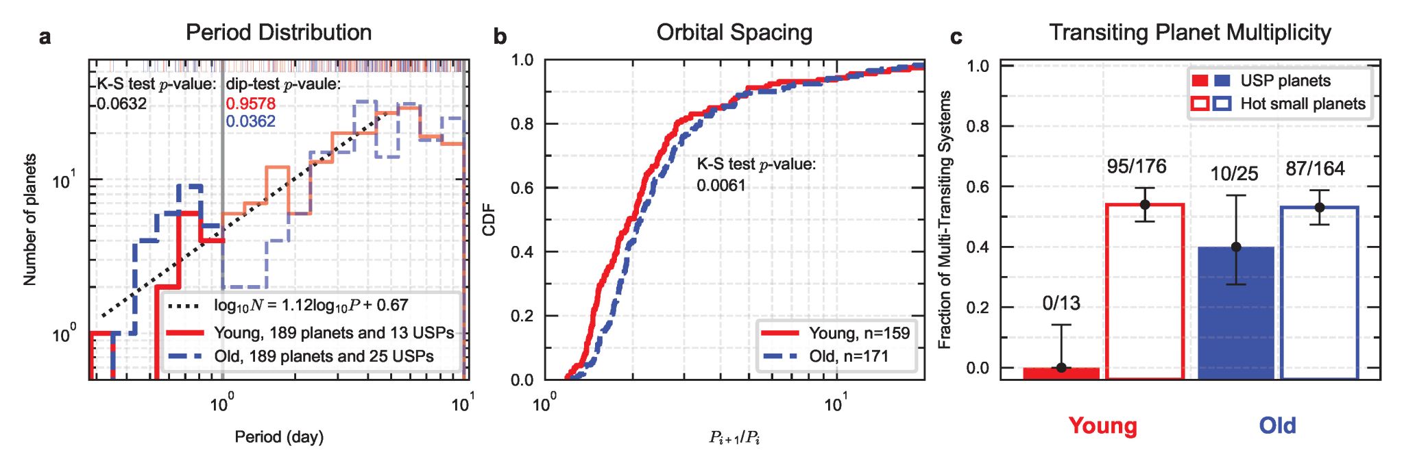 图3:年轻与年老的超短周期行星系统及短周期小质量行星系统之间轨道构型的比较。左、中、右分别为轨道周期分布、轨道间距分布,以及多凌星系统比例的比较结果。