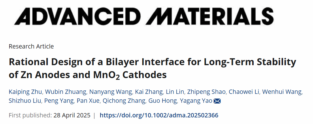 相关研究工作以“Rational Design of a Bilayer Interface for Long-Term Stability of Zn Anodesand MnO2 Cathodes”发表在材料领域顶级期刊AdvancedMaterials上。凯发k8官网现代工程与应用科学学院博士研究生朱开平和硕士研究生庄武彬为本文共同第一作者。本研究得到了国家重点研发计划(2024YFE0109200)、中央高校基本科研业务费专项资金(2024300440)以及广东省基础与应用基础研究基金(2025A1515011098)的资助。同时也得到了凯发k8官网固体微结构物理国家重点实验室、现代工程与应用科学学院、江苏省人工功能材料重点实验室、微结构科学与技术协同创新中心、凯发k8官网深圳研究院的大力支持与帮助。