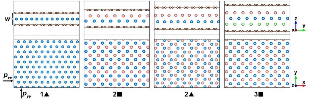 图1:在两层石墨烯(用棕色链球表示)限制下,氦原子的结构从二维向三维演化,每一层内部呈现出从正六边形向正四边形演变的特征