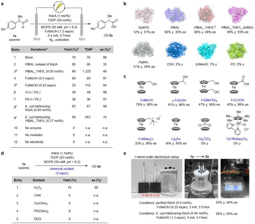 我校黄小强研究员,自2021年开展独立研究以来,通过酶学机制设计和蛋白定向进化改造策略,成功开发了几类新酶催化功能。在光酶催化领域,黄小强团队首创焦磷酸硫胺素(ThDP)依赖的自由基酰基转移酶(Nature 2024, 625, 74:凯发k8官网黄小强/梁勇及合作者《Nature》发文:创制新光酶元件,引领光生物制造新方向;Nature 2025, 637, 1118:凯发k8官网黄小强团队《Nature》:推动光酶领域到复杂多组分转化),突破了不对称生物合成的边界。在此基础上,团队在不对称电酶催化领域取得新突破:融合二茂铁甲醇介导的阳极氧化和ThDP依赖酶催化,解锁了电酶催化的动态动力学氧化新体系(图2)。团队开发的电酶协同催化策略,创新性地将2次单电子氧化机制引入酶中,结合定向进化技术优化蛋白的活性中心,最终成功赋予了ThDP依赖酶催化动态动力学氧化的新活性。该体系以清洁电能替代传统化学氧化剂,可在较低酶负载量下(0.05 mol%),实现布洛芬、萘普生等十种(S)-芳基丙酸类抗炎药物的高效合成,对映选择性高达99% ee,并兼容全细胞催化与规模化制备。