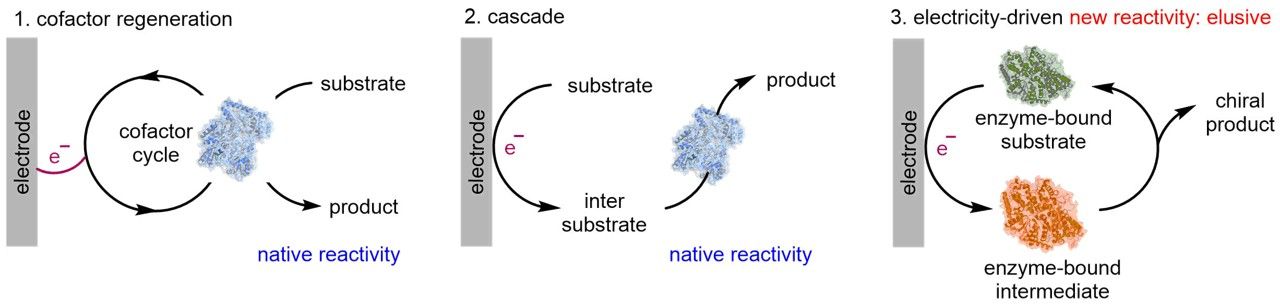 近年来,人工酶和光酶催化等策略的发展,不断突破生物合成的边界。另一方面,电化学合成作为化学合成领域快速发展的创新工具,具有廉价、电势可控和可持续等多重优势。当前电化学合成与酶催化的结合主要集中在以下两类(图1):通过电化学来实现酶的辅因子再生,继而实现酶的天然反应;电化学生成的中间体或底物参与后续酶催化天然转化中(电化学/酶级联)。然而,如何利用电化学驱动酶催化,去解锁非天然的新催化模式,仍待突破。